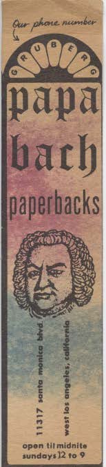 It was early 1967: I was still exploring my new Los Angeles home on foot and by bus. (It was to be almost twenty years before I began to drive.) On the north side of Santa Monica Boulevard, just west of Sawtelle, sat a big bookstore with a sign that said Papa Bach Paperbacks. Even at that early juncture, I was a bookstore aficionado of long standing, a habitué of Schroeder’s on Public Square in Cleveland and the Dartmouth College Bookstore in Hanover, New Hampshire.