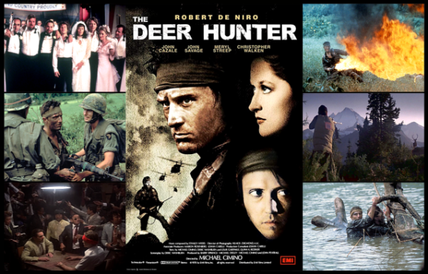 “The Deer Hunter is a 1978 American epicwardrama film co-written and directed by Michael Cimino about a trio of Russian-American steelworkers whose lives were changed forever after fighting in the Vietnam War. The three soldiers are played by Robert De Niro, Christopher Walken, and John Savage, with John Cazale (in his final role), Meryl Streep, and George Dzundza playing supporting roles. The story takes place in Clairton, Pennsylvania, a working-class town on the Monongahela River south of Pittsburgh, and in Vietnam. …”