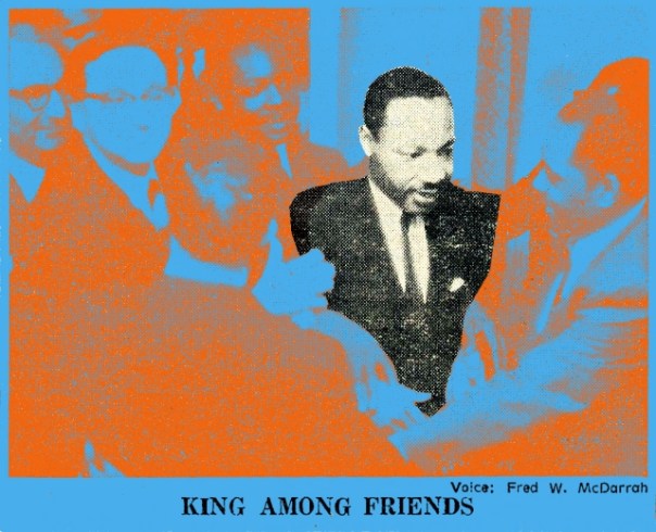 “Less than a year before his assassination, the Reverend Martin Luther King Jr. came to Harlem. In the June 22, 1967, Village Voice, contributor Marlene Nadle observed the crowd anxiously awaiting the Baptist minister’s arrival: ‘Using programs folded accordion style instead of pastel fans with pictures of Christ, they managed to turn the chandeliered ballroom of the Hotel Roosevelt into a Baptist Church.’ At times during her reporting on the event, Nadle comes across as jaded, as in her description of when the audience initially glimpses King in a movie being shown by the hospital workers’ union, which had arranged the event: ‘The Lord appeared for the first time — on film. There was a great burst of applause.’ But when King arrives in the flesh and delivers his speech, Nadle acknowledges why the crowd is so rapt: ‘What he said was not important. It was the man who…