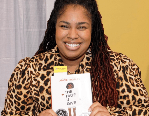 Angie Thomas with her compelling novel. (Teen Vogue photo.)