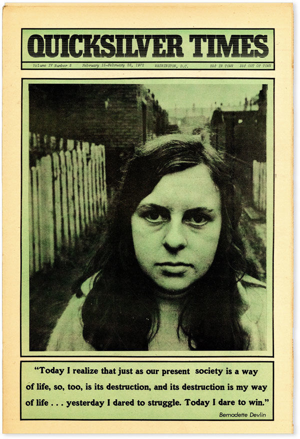 “Quicksilver Times was an antiwar, counterculture underground newspaper published in Washington, DC. Its first issue was dated June 16, 1969, with Terry Becker Jr., a former college newspaper editor and reporter for the Newhouse News Service, the main instigator in the founding group of antiwar activists. It ran for 3 years, with its final issue (vol. 4, no. 9) appearing in Aug. 1972. Publication was irregular and during the latter part of its run it was publishing once every 3 weeks. It was a member of the Liberation News Service and the Underground Press Syndicate. Quicksilver Times was one of several anti-government underground papers of the period now known to have been infiltrated by government informants. Along with opposition to the Vietnam War, the paper was outspoken in its support for the Black Panthers, feminism, gay rights, and other movements of the period…