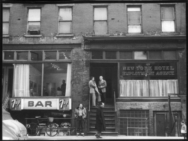 Dutch American artist Willem de Kooning (1904 – 1997) (center, with light hair) speaks with an unidentified couple at the top of a stoop next door to the Tanager Gallery (the storefront above the ‘Bar’ sign) on 10th Street, New York, New York, April 5, 1959.