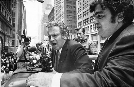 Norman Mailer, at the microphone, campaigning for mayor in the garment district with Jimmy Breslin in June 1969.