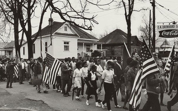 Participants, some carrying American flags, marching in the civil rights march from Selma to Montgomery, Alabama in 1965
