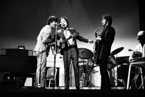 Bob Dylan and ‘The Band’ performing at the Woody Guthrie memorial concert In New York City’s Carnegie Hall on January 20, 1968.