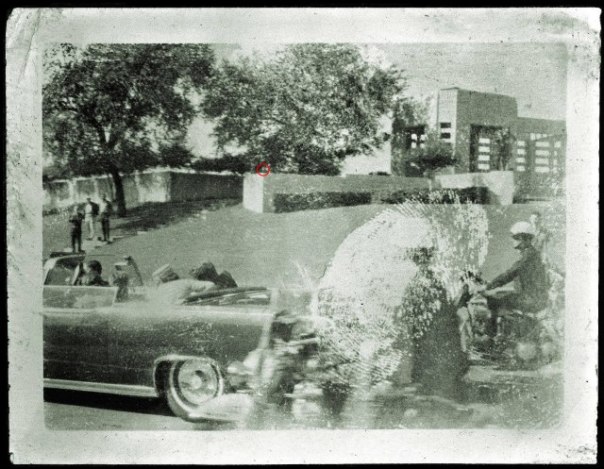 The degraded original version of the Moorman photograph: the Badge Man is purportedly located behind the stockade fence at photo center.